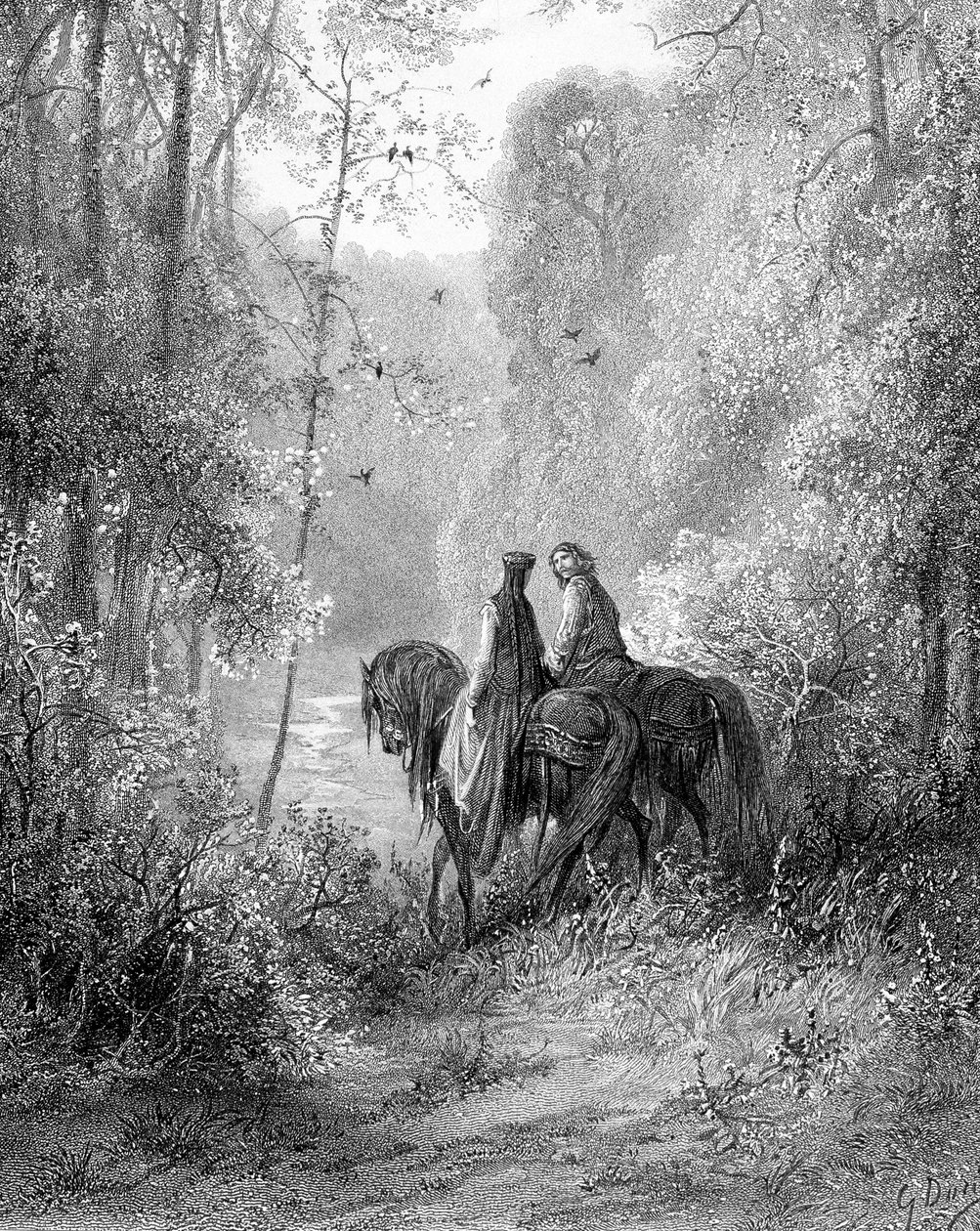 legende · kostüm · landschaft · ländlich · liebe · blume · liebende · blumen · arthur · mittelalterlich · reiten · wald · bewaldet · guinevere · paradies · reiten · pferde · fern · ritter · tisch · romantisch · ritter der runde tisch · rund · literarisch · romantik · literatur · pferd · lancelot · Private Collection / Bridgeman Images