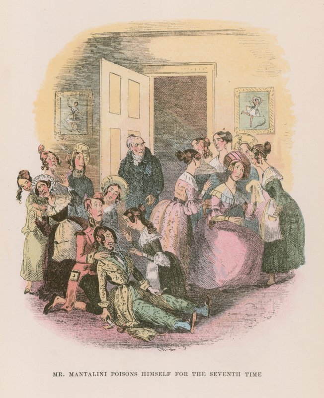 nicholas nickleby · charles dickens · roman · englisch · literatur · herr mantalini · frau mantalini · vergiften · versucht · selbstmord · gruppe · Private Collection / Bridgeman Images · / Look and Learn