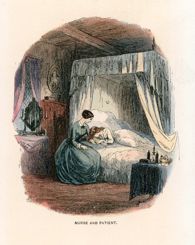 bleak house · charles dickens · roman · englische literatur · krankenschwester und patient · bett · schlafzimmer · Private Collection / Bridgeman Images · / Look and Learn |