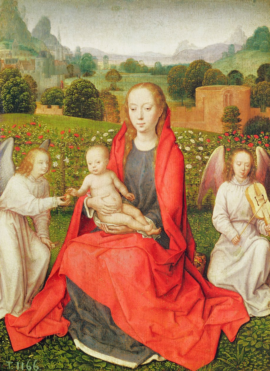 jungfrau maria · christkind · garten · geige · landschaftshintergrund · renaissance des nordens · hierarchie der skala · rosen · mutter · mutter · Prado, Madrid, Spain / Bridgeman Images