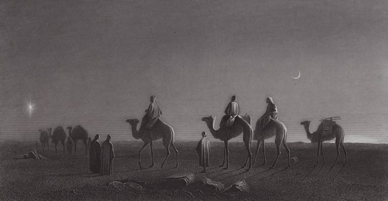 19. jahrhundert · bibel · stern · gravur · heilige drei könige · schwarz-weiß · mzen-gravur · Private Collection / Bridgeman Images · / Look and Learn