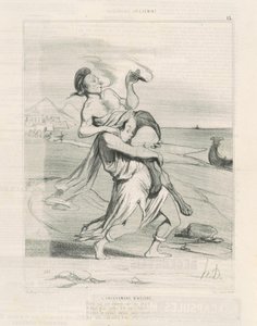 Alte Geschichte: Menelaos Sieger, Karikatur zur Illustration eines Auszugs aus der Ilias von Homer: „Auf den rauchigen Mauern des prächtigen Troja, Menelaos, Sohn der Götter, wie eine reiche Beute, entführt seine blonde Helena und bringt sie zu seinem Hof,(Ancient story: Menelas winner, caricature to illustrate an excerpt from the Iliad of Homere: “On the smoky ramparts of the superb Troy, Menelas, son of the gods, like a rich prey, ravishes her blonde Helene and takes her to her court More beautiful than ev)Honoré Daumier |