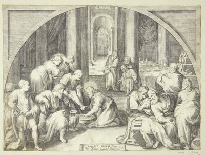 Christus wäscht die Füße der Apostel(Kristus vasker apostlenes fødder)Jacob Matham,Taddeo Zuccaro(after model by),Johannes Janssonius(publisher) |