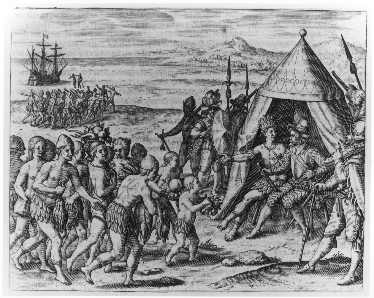 Sir Walter Raleigh (1554-1618) versucht, Freundschaft mit König Arromaia von Guiana zu schließen, aus 'Americae', graviert und geschrieben von Theodor de Bry (1528-98)(Sir Walter Raleigh (1554-1618) trying to establish friendship with King Arromaia of Guiana, from 'Americae', engraved and written by Theodor de Bry (1528-98) )Jacques Le Moyne |