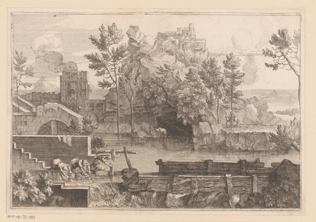 Landschaft mit See und drei badenden Frauen(Landschap met meer en drie wassende vrouwen)Jacques Prou(print maker),Sébastien Bourdon(after painting by),Lodewijk XIV (koning van Frankrijk) |