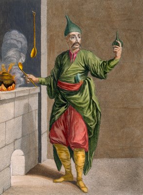 illustration · türkisch · osmanisches reich · türkei · ast-chi · koch · köche · kochen · herd · topf · kamin · ofen · flammen · kostüm · mode · kleid · ganzkörperansicht · orientalismus · exotisch · orientalisch · gerard jean baptiste scotin · nationen · levante · levantine · charles de ferriol · männchen · ganzkörperansicht · roben · kopfschmuck · schnurrbart · rauch · sultan · küche · zwiebel · Löffel · Essen · Private Collection / Bridgeman Images