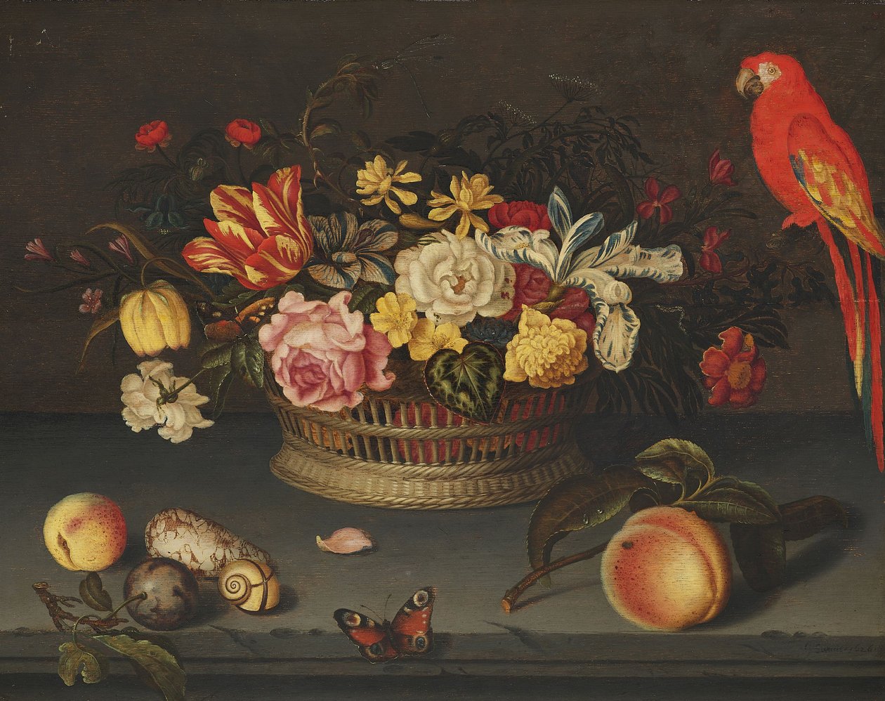 Stillleben mit Blumenkorb und Papagei(Still Life with Flower Basket and Parrot)Jeronimus Sweerts |