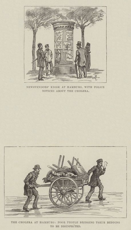 cholera · hamburg · zeitungsverkäufer-kiosk · polizeiliche hinweise · arme leute · bringen · bettwäsche · desinfiziert · epidemien · deutschland · Private Collection / Bridgeman Images · / Look and Learn |