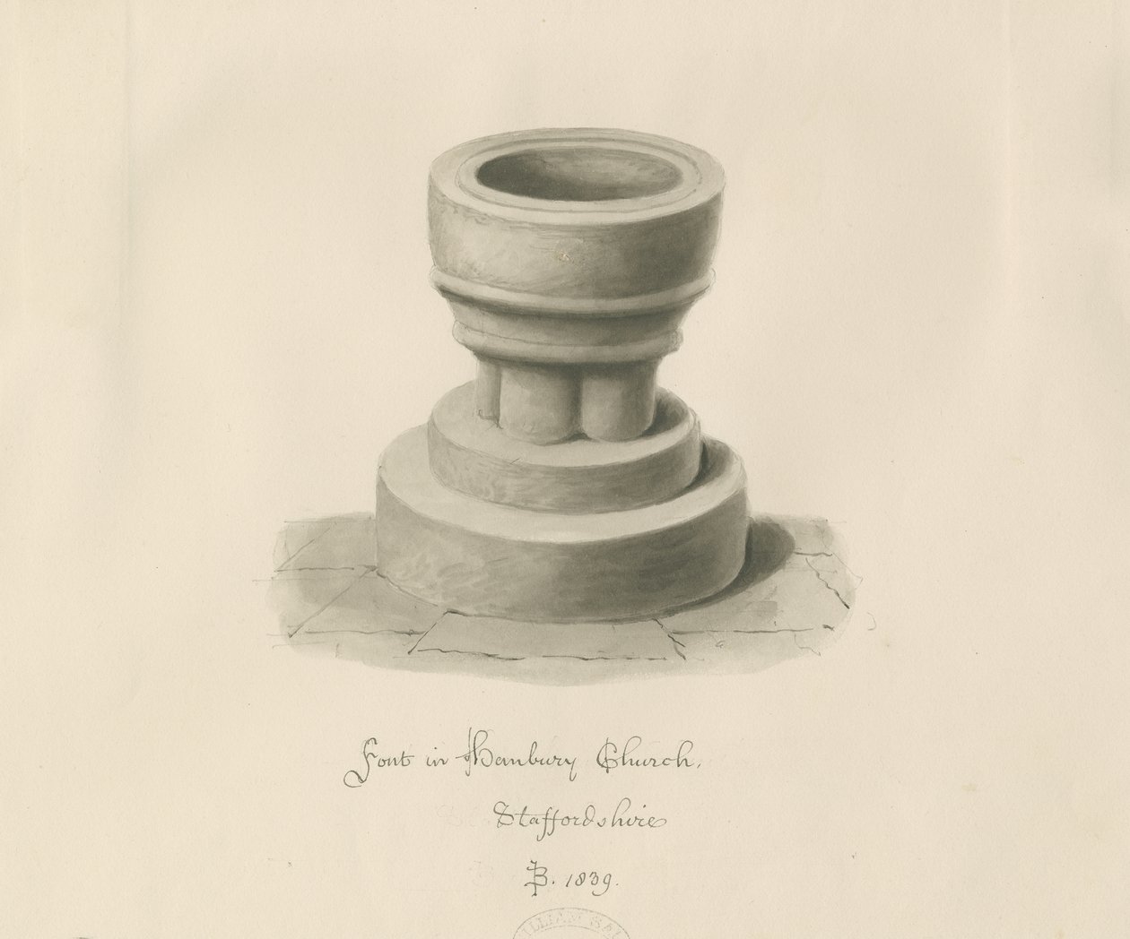 Taufbecken in der Hanbury Church: Sepia-Zeichnung(Font in Hanbury Church: sepia drawing)John Buckler |
