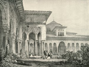 löwenhof · 12 löwen aus marmor · löwe · wasserlauf · innenhof · polygonales becken · bogen · geschnitzt · schnitzerei · 1377 begonnener innenhof · islamische architektur · maurisch · palast · skizzenblock · weiblich · plaudern · sprechen · 14. jahrhundert · muhammad v · Private Collection / Bridgeman Images |