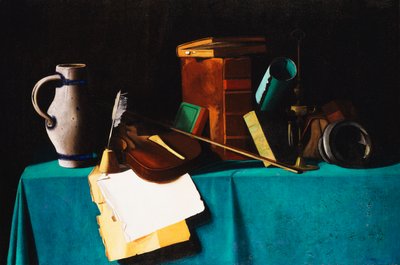 buch · 20. jahrhundert · tischdecke · krug · 19. jahrhundert · tintentopf · papier · papiere · stillleben · feder · tromp loeil · vase · Private Collection / Bridgeman Images