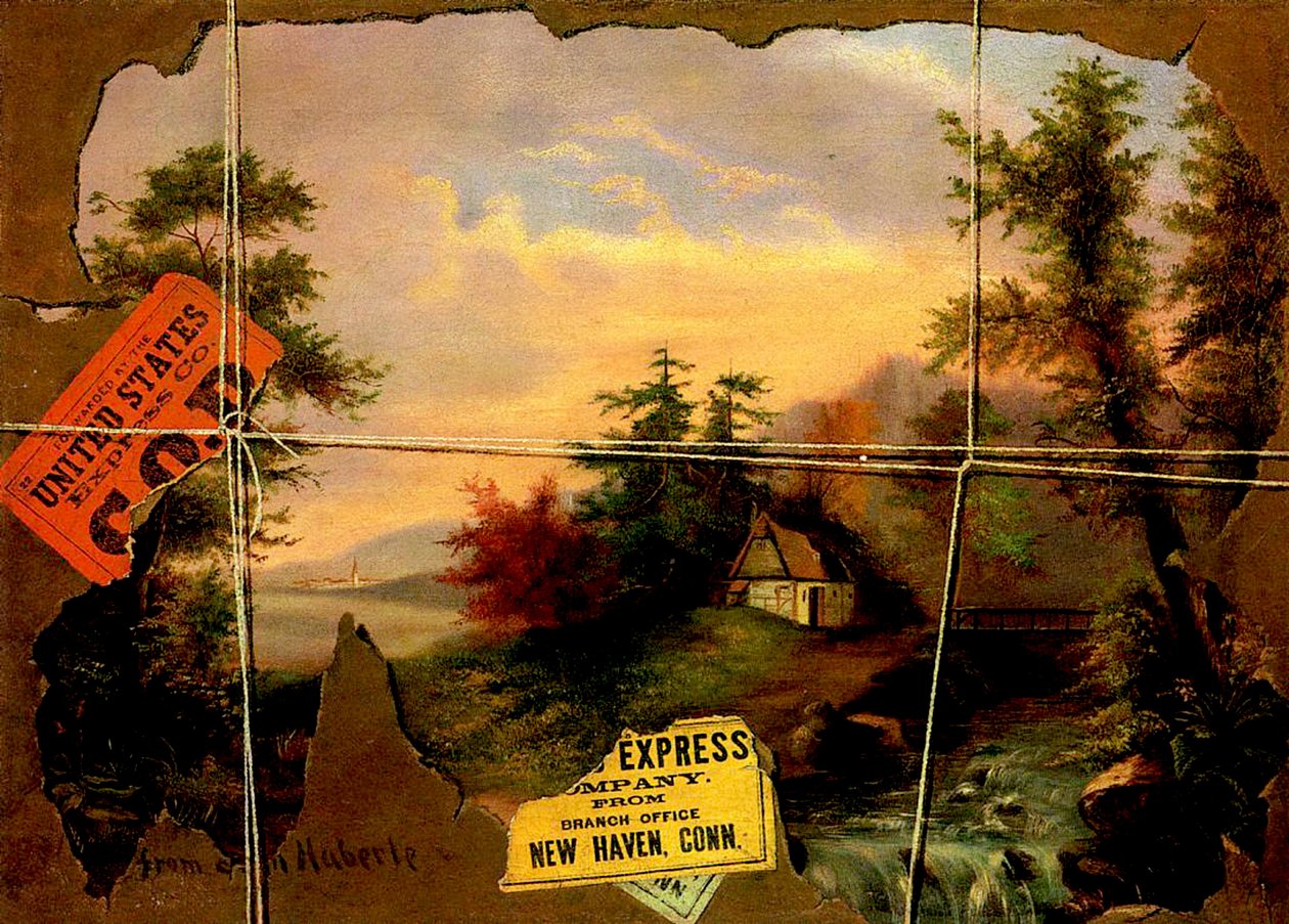 trompe l' · oeil · paket · schnur · stempel · briefmarken · zerrissen · kaputt · papier · paket · landschaft · malerei · ländlich · landschaft · amerika · amerikanisch · nordamerika · Private Collection / Bridgeman Images |
