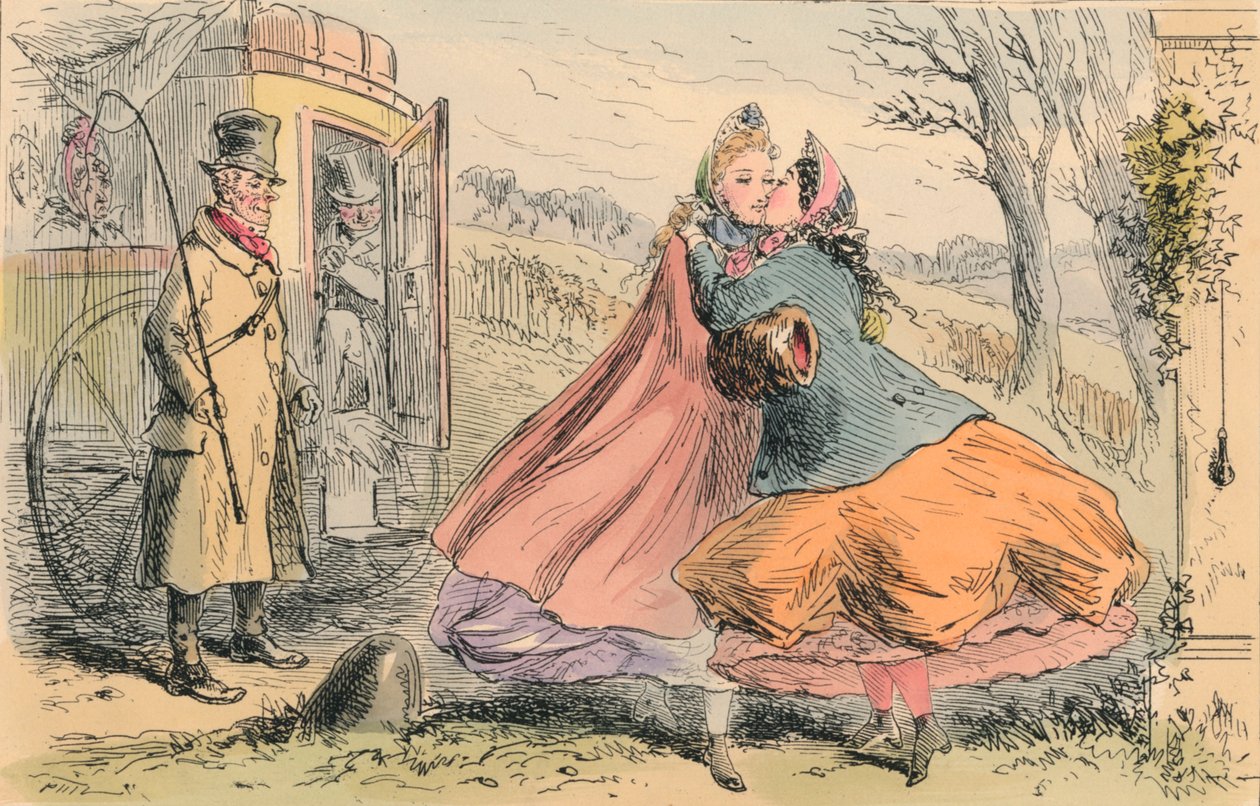 transport · transport · frau · frauen · frau · leute · umfassen · trainer · umarmen · besetzung · küssen · kleidung · britisch · farbe · kutscher · mütze · kleid · position · victorian · jahrhundert · ankunft · großbritannien · beruf · kuß · willkommen · begrüßen · gruß · umfassen sie · dame · konzept · ankommen · umarmung · straße transport · farbe · 19. jahrhundert · begrüßung · bandrock · 19.jahrhundert · engraving · john leech · leech · john · baldon hall · The Print Collector/Heritage Images |