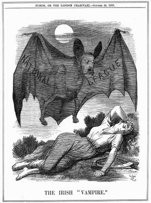 Irische National League, mit dem Gesicht von Charles Stewart Parnell (1846-1891), dargestellt als Vampir, der sich an Irland vergreift. John Tenniel Karikatur aus Punch London, 24. Oktober 1885. Gravur(Irish National League, with face of Charles Stewart Parnell (1846-1891), shown as a vampire preying on Ireland. John Tenniel cartoon from Punch London, 24 October 1885. Engraving)John Tenniel |