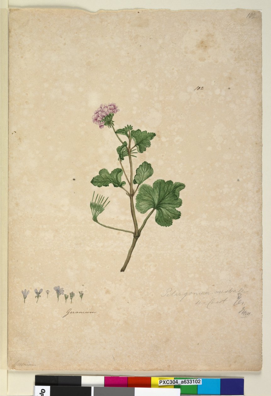 Seite 102. Pelargonium australe(Page 102. Pelargonium australe, c.1803-06 (wc, pen, ink and pencil))John William Lewin |