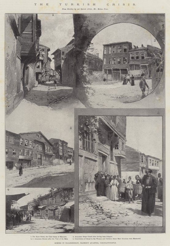 türkische krise · szenen · halidjioglou · haskeny-viertel · konstantinopel · hauptstraße · hauptszene · massaker · armenische häuser · besuch · armenische geschäfte · geschlossen · geplündert · verteilung · brot · frauen · kinder · männliche beziehungen · massakriert · truthahn · istanbul · Straßenszenen · Private Collection / Bridgeman Images · / Look and Learn |