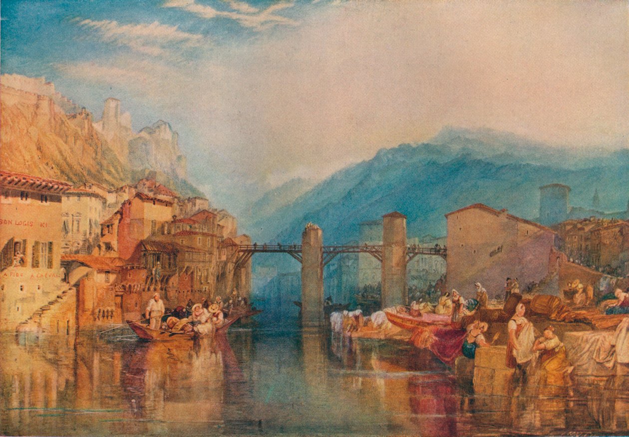 transport · transport · draußen · fluß · leute · mann · mann · männer · stadt · boot · boote · berg · berge · frankreich · kerl · brücke · ansicht · museum · geographie · farbe · farbe · braun · isere · position · jahrhundert · gemeinschaft · vista · zwanziger jahre · publikation · rhône-alpes · 19. jahrhundert · wassertransport · hintergrundleute · zwanziger jahre · 20. jahrhundert · 19.jahrhundert · watercolour · landscape · rhône-alpes · jmw turner · j m w turner · river drac · isère · turner · joseph mallord william · joseph mallord william turner · studio publications · joseph turner · studio volume 81 · The Print Collector/Heritage Images |