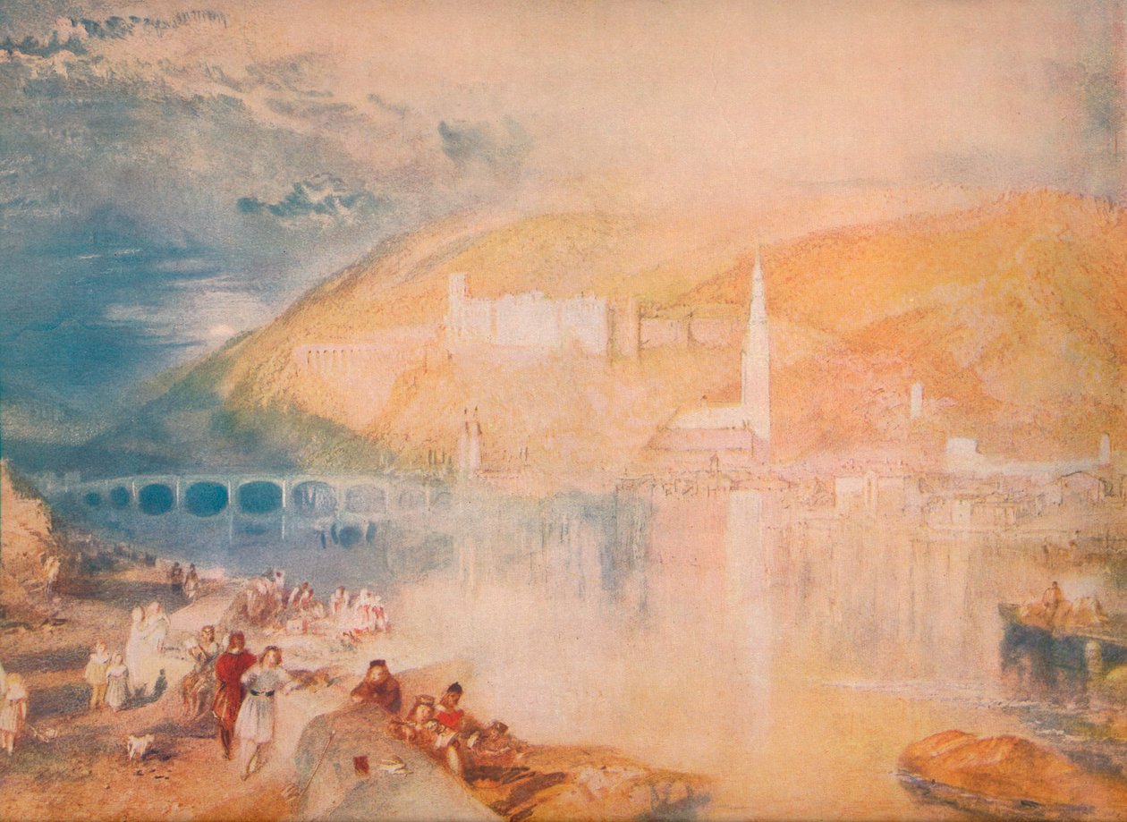 atmosphärisch · transport · transport · sonnenuntergang · draußen · deutschland · stadt · fluß · gebäude · gebäude · leute · fromm · boot · boote · deutsch · künste · land · sonne · religion · wissenschaft · kunst · abend · romantisch · brücke · solarsystem · astronomie · geographie · kirche · schloß · farbe · farbe · christentum · verstärkung · position · jahrhundert · galerie · heidelberg · konzept · riverbank · zeit · romanticism · watercolour · graphit · kunstgalerie · baden-wurttemberg · tägliches leben · heidelberg schloß · 19. jahrhundert · wassertransport · 1910s · 20. jahrhundert · 19.jahrhundert · jmw turner · j m w turner · joseph · bibby · turner · joseph mallord william · romantic era · joseph mallord william turner · joseph turner · art centre · bodycolour · manchester city galleries · joseph bibby · priory publishing press · the priory publishing press · liverpool · The Print Collector/Heritage Images