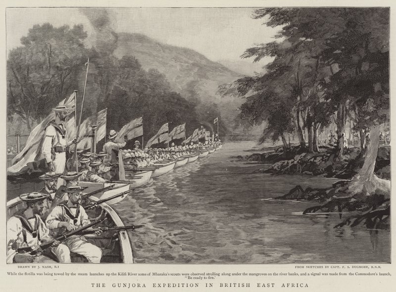 gunjora expedition · britisch-ostafrika · flottille · abgeschleppt · steam startet · kilifi river · mbarakas späher · beobachteten · bummeln · mangroven · flussufer · signal · commodore' · s launch · marine · militär · boote · Private Collection / Bridgeman Images · / Look and Learn |