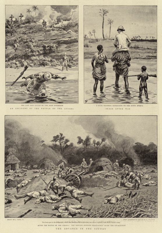 voraus · sudan · vorfall · schlacht · atbara · mann · getötet · 10. sudanesen · ente · schießen · expedition · fluss atbara · frieden · krieg · derwisch position · engagement · militär · sudan · afrika · Private Collection / Bridgeman Images · / Look and Learn |