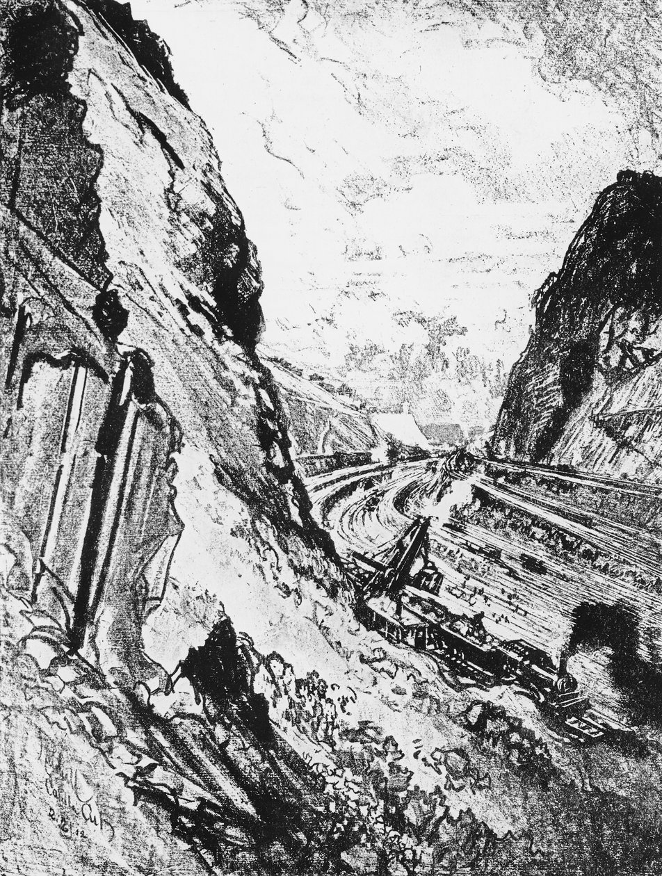 (The Cut Looking Towards Culebra, plate XV from 'The Panama Canal' by Joseph Pennell, 1912 (charcoal on paper) )
