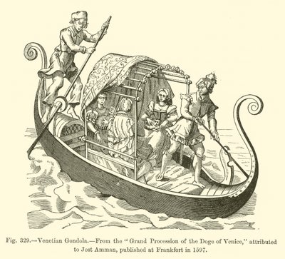 Venezianische Gondel, aus der großen Prozession des Dogen von Venedig, Illustration aus Wissenschaft und Literatur im Mittelalter und der Renaissance, geschrieben und graviert von Paul Lacroix, 1878(Venetian Gondola, from Grand Procession of the Doge of Venice, illustration from Science and Literature in the Middle Ages and the Renaissance, written and engraved by Paul Lacroix, 1878 ()Jost (after) Amman |