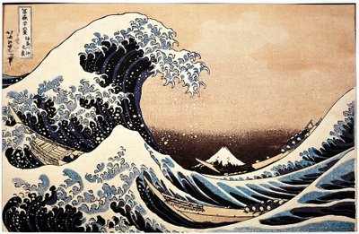 Die große Welle vor Kanagawa gilt als eines der weltweit bekanntesten Werke der japanischen Kunst. Es ist ein Farbholzschnitt des japanischen Künstlers Katsushika Hokusai und gehört zu der Bildserie „36 Ansichten des Berges Fuji“ in der er die Landschaften rund um den Fuji darstellte. Die große Welle scheint mit ihrer Macht die Fischer verschlingen zu wollen, die dem stürmischen Meer hilflos ausgeliefert sind. Das Bild hat eine beeindruckende Dynamik die den Kontrast zwischen der Vergänglichkeit des menschlichen Lebens und der imposanten Natur zur Geltung bringt. Die Form der Linie zwischen Himmel und Meer zeigt das Symbol des Yin und Yang und spiegelt somit auf den Gegensatz zwischen den hellen, himmlischen und den dunklen, irdischen Kräften wieder. Die Zahl der Originale beläuft sich wohl auf einige hundert. Diese sind mehr als 180 Jahre alt und weisen Unterschiede in den Farben auf: Die Farbe des Himmels variiert von gelb bis rosa und auf einigen Drucken sind die Wolken nicht zu erkennen. Wegen den unterschiedlichen Farben und der Abnutzung der Holzblöcke gleicht kein Druck den anderen.