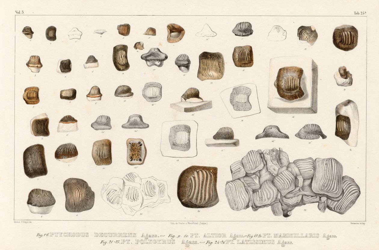 Tafel 25b aus Band 3 (Recherches sur les poissons fossiles) zeigt Zahn verschiedener Arten der Gattung Ptychodus(Table 25b of Volume 3 (Recherches sur les poissons fossiles) showing tooth of different species of the genus Ptychodus)Louis Agassiz |