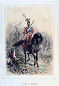 Illustration aus dem Buch „The Memorial of Saint Helene“ von Graf Emmanuel de Las Cases: Porträt eines niederländischen Lanzenträgers (Roter Lanzenträger des 2. Regiments der leichten Kavallerie der Kaiserlichen Garde)(Illustration of Bombled Louis (1862-1927) from the book “The Memorial of Saint Helene” by Count Emmanuel de Las Cases (1766-1842): Portrait of a Dutch Lancer (Red Lancer of the 2nd, th regiment of light horses of the Imperial Guard), Private Collection)Louis Charles Bombled |