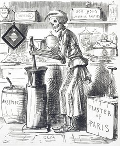 antikamnia kalender · schmerzen · linderung · skelett · schädel · knochen · medizinisch · medizin · die dinge · die ihn beschäftigt halten · drogen · herstellung · entwerfen · apotheker · apotheke · telefon · flaschen · phiole · surreal · seltsam · bizarr · surrealismus · seltsam · ungerade · kuriosität · Private Collection / Bridgeman Images · / Look and Learn |