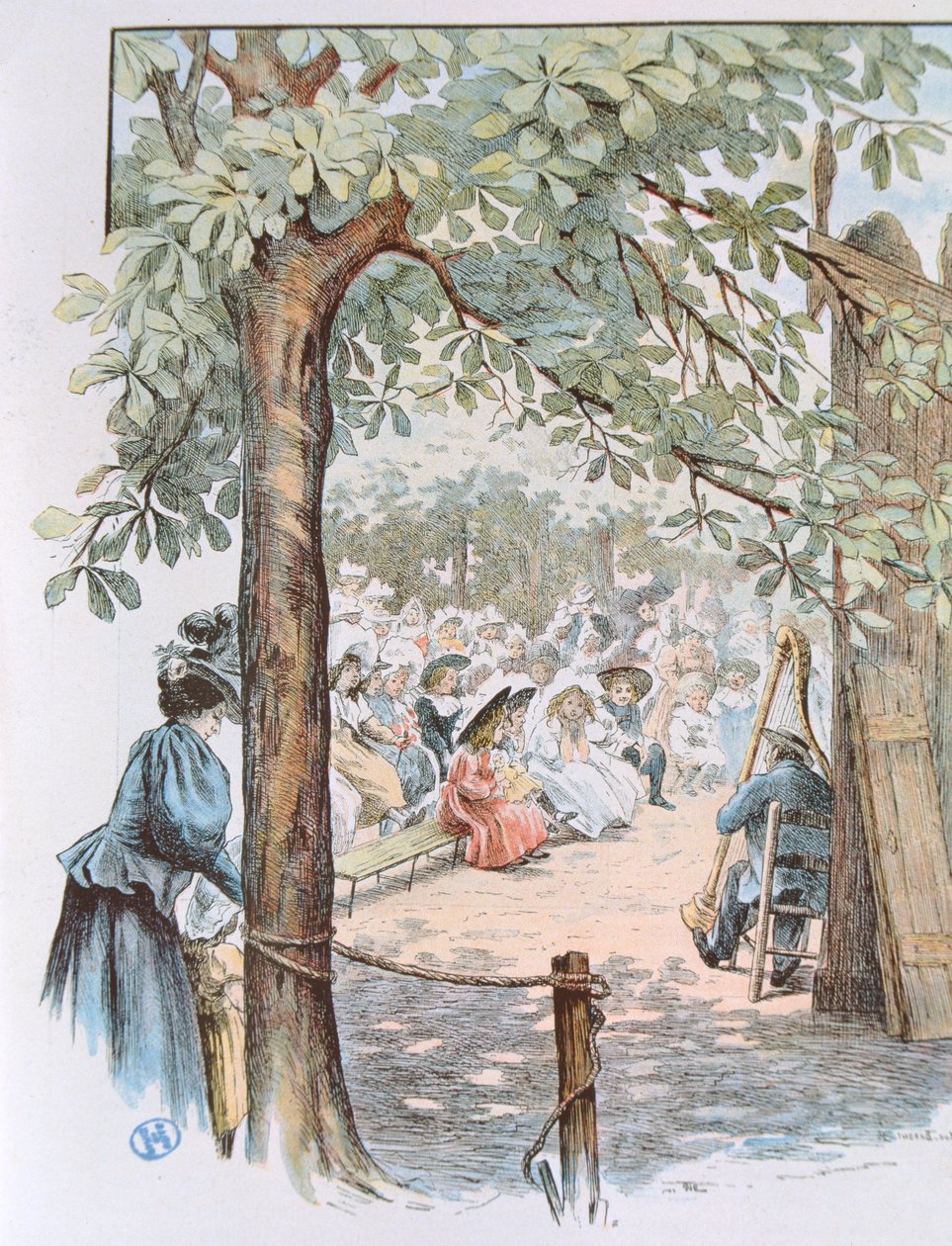 marionette · show · luxembourg gardens · paris · luxemburg · marionetten · guignol · marionette · marionetten · punsch und judy · unterhaltung · kinder · publikum · jungen · mädchen · harfe · harfenist · musik · pariser · theater · draußen · publikum · draußen · Private Collection / Bridgeman Images |