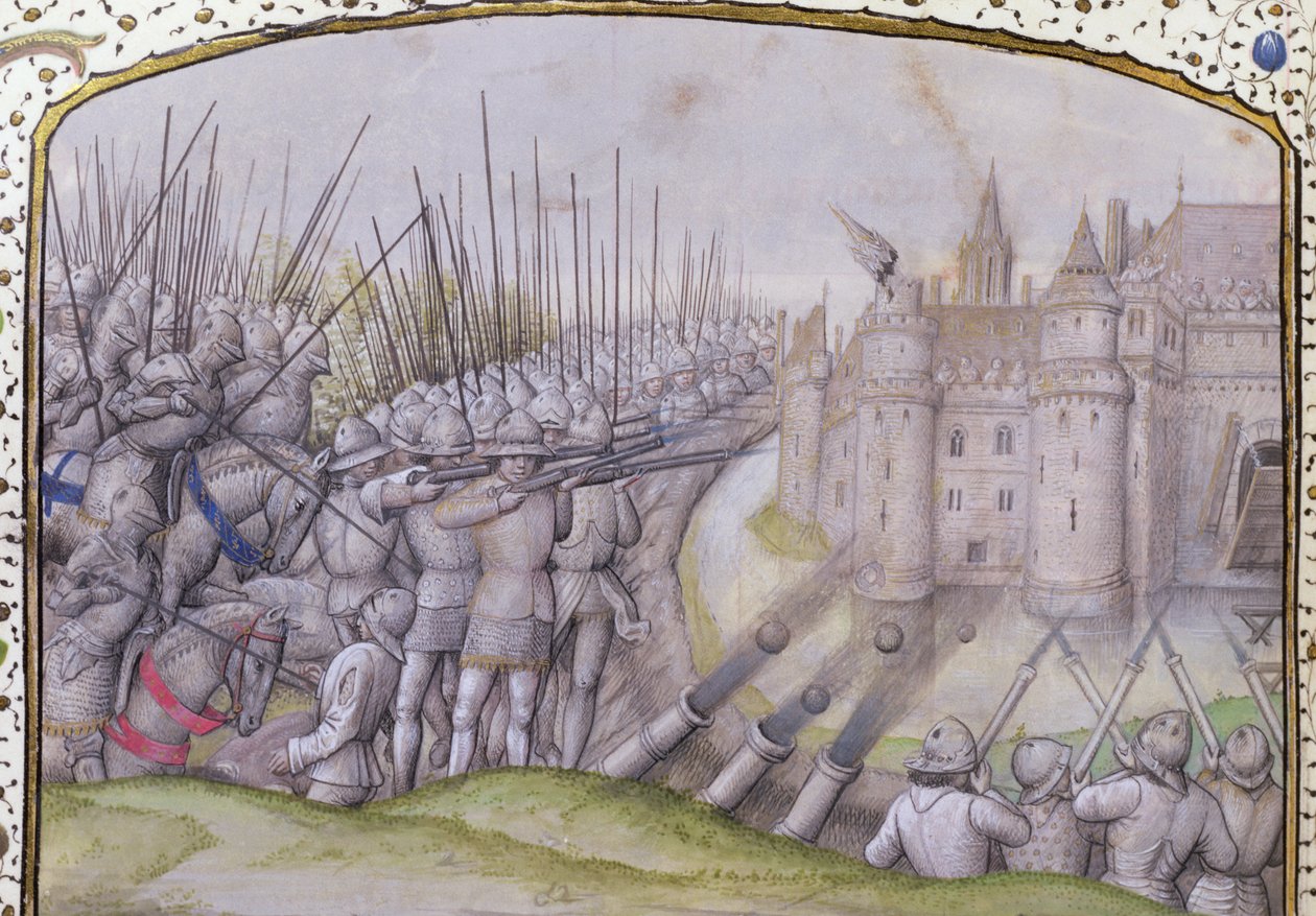 schlachtfeld · ville d' · avray · mittelalter · kanone · angriff · grisaille · ball · soldaten · lanze · armee · soldat · burg · burggraben · chronik · manuskript · beleuchtet · beleuchtung · kriegsführung · waffe · waffen · mittelalter · 15. jh · By kind permission of Lord Leicester and the Trustees of Holkham Estate, Norfolk / Bridgeman Images |