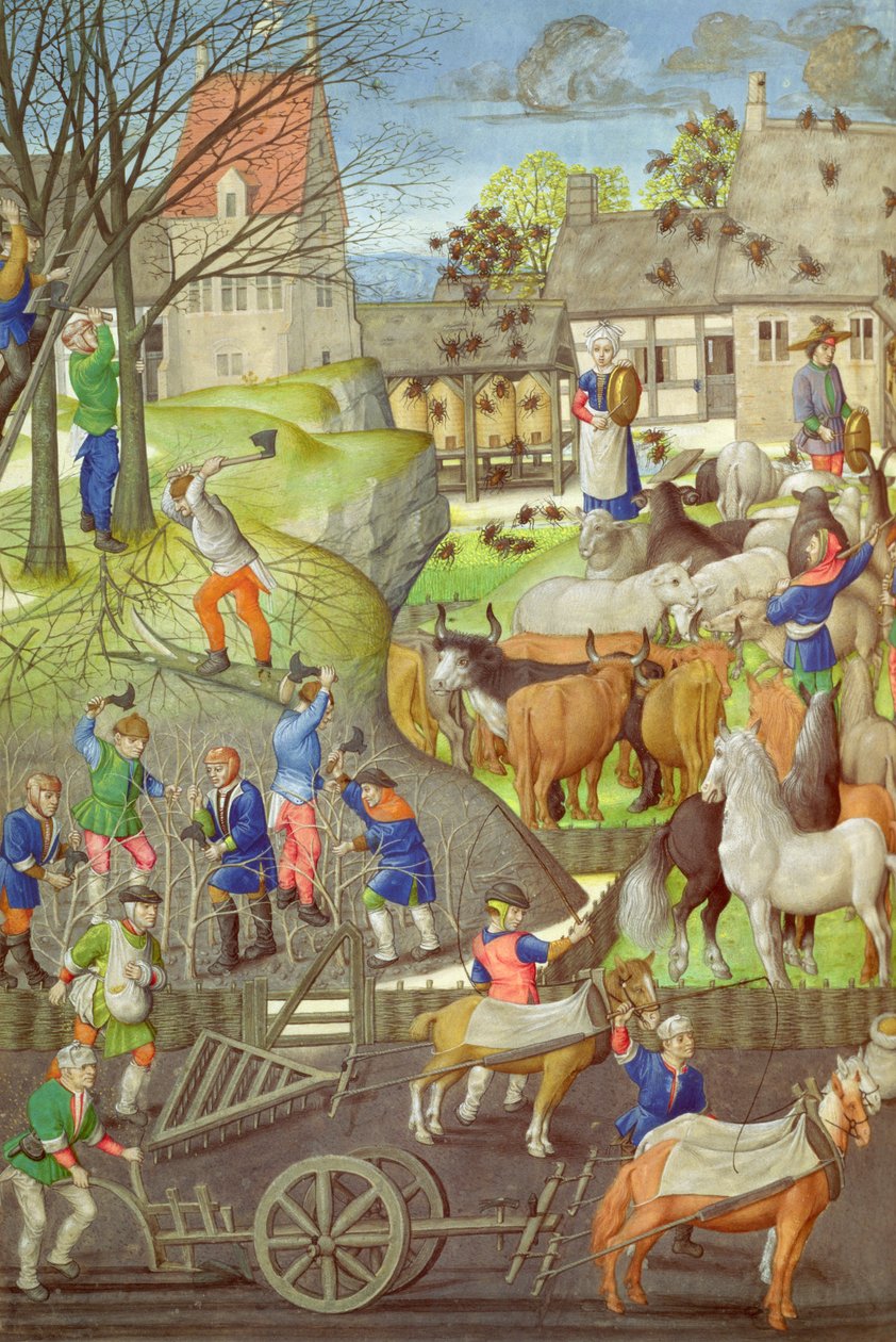 georgics · virgil · vergil · manuskript · illustration · jan crabbe · hacken · holz · arbeit · jahreszeit · frühling · pflügen · vieh · schaf · herde · land · bienenhaus · imkerei · schwarm · bienen · kolonie · abferkeln · landwirtschaft · mittelalter · pflanzen · arbeiten · veranlagte architektur · biene · honig · bienenstock · pferd · charrue · 15. jh. · nördliche renaissance · brügge · landwirtschaft · arbeit · arbeit · arbeiter · pferde · schweine · haltung · biene · bienenstöcke · bienenstöcke · de Baenst · By kind permission of Lord Leicester and the Trustees of Holkham Estate, Norfolk / Bridgeman Images |