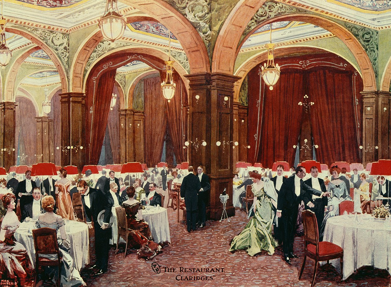 mahlzeit · essen · speisen · essen · essen · inneneinrichtung · speisesaal · claridges · diners · abendkleid · schwarze krawatte · gesellschaft · mahlzeit · tuxedo · restaurant · Bibliotheque des Arts Decoratifs, Paris, France / Bridgeman Images |