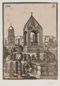 Unidentifizierte Moschee mit 1 Minarett, links hoher Baum(Uidentificeret moské med 1 minaret, t.v. højt træ)Melchior Lorck |