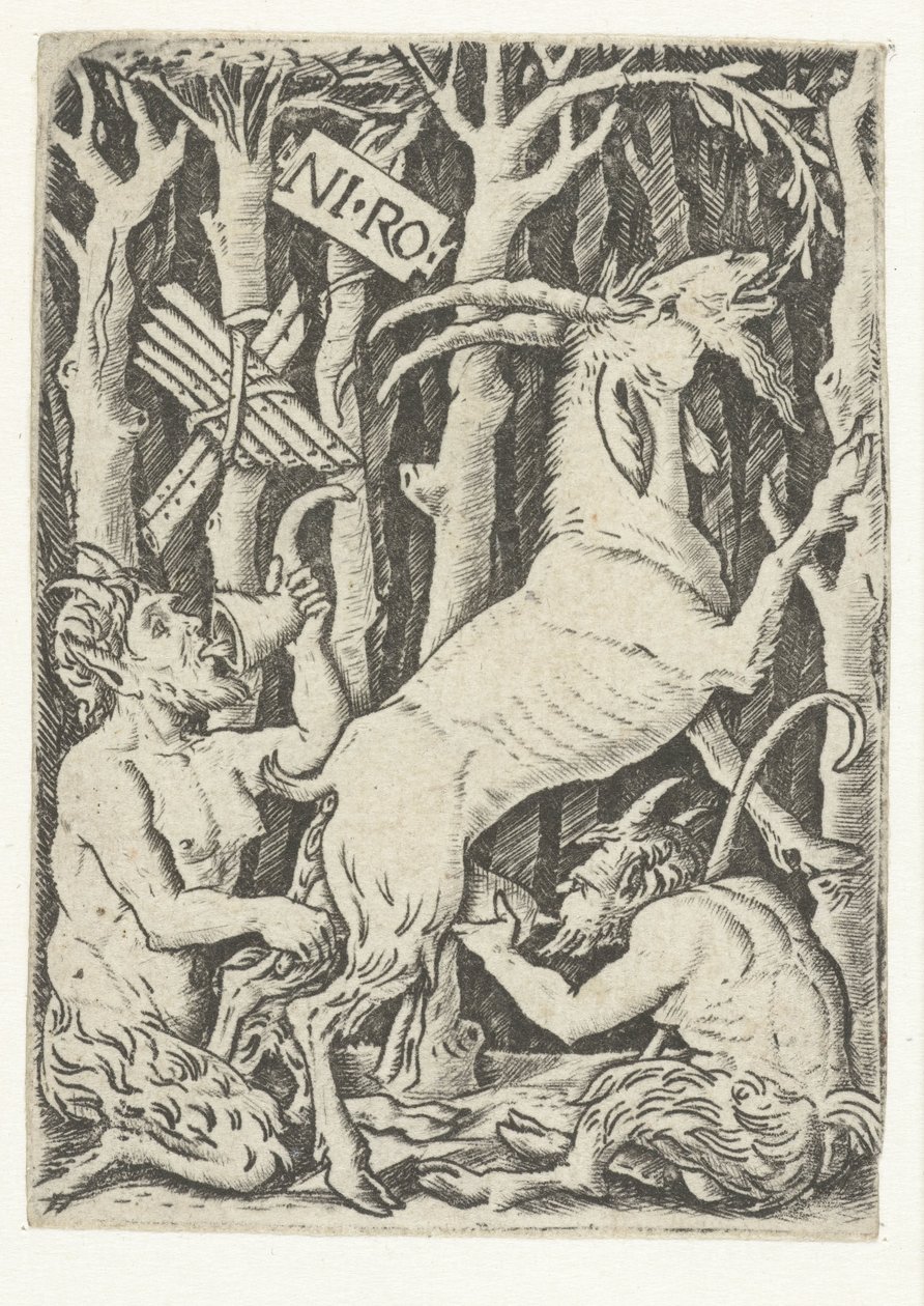 Zwei Satyrn trinken Milch von einer Ziege(Twee satyrs drinken melk van geit)Nicoletto da Modena(print maker),Nicoletto da Modena(after own design by) |
