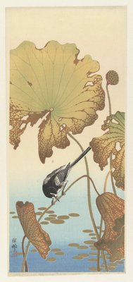 Japanische Bachstelze auf Lotuspflanze(Japanse kwikstaart op lotusplant)Ohara Koson(print maker),Watanabe Shôzaburô(publisher) |