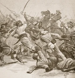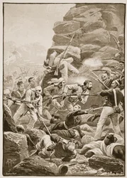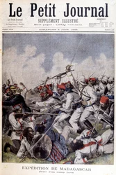 Madagaskar-Expedition, Einnahme eines Hova-Lagers, Illustration aus 'Le Petit Journal', Supplement illustre, 2. Juni 1895, graviert von Henri Meyer (1844-91)(Madagascar expedition, taking of an hova camp, illustration from 'Le Petit Journal', Supplement illustre, 2nd June 1895, engraved by Henri Meyer (1844-91) )P.H.G.V. Michel |