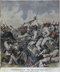 armee · mann · soldat · soldaten · militär · schlachtfeld · schlacht · gewehr · gewehre · pistole · gewehre · schießen · angriff · angriff · bajonett · protektorat · kolonie · kolonialzeit · besetzung · annexion · kolonialzeit · kolonialismus · imperialismus · afrikaner · schwarz · uniform · tropenhelm · helme · topee · madagassisch · expeditionskorps · Private Collection / Bridgeman Images