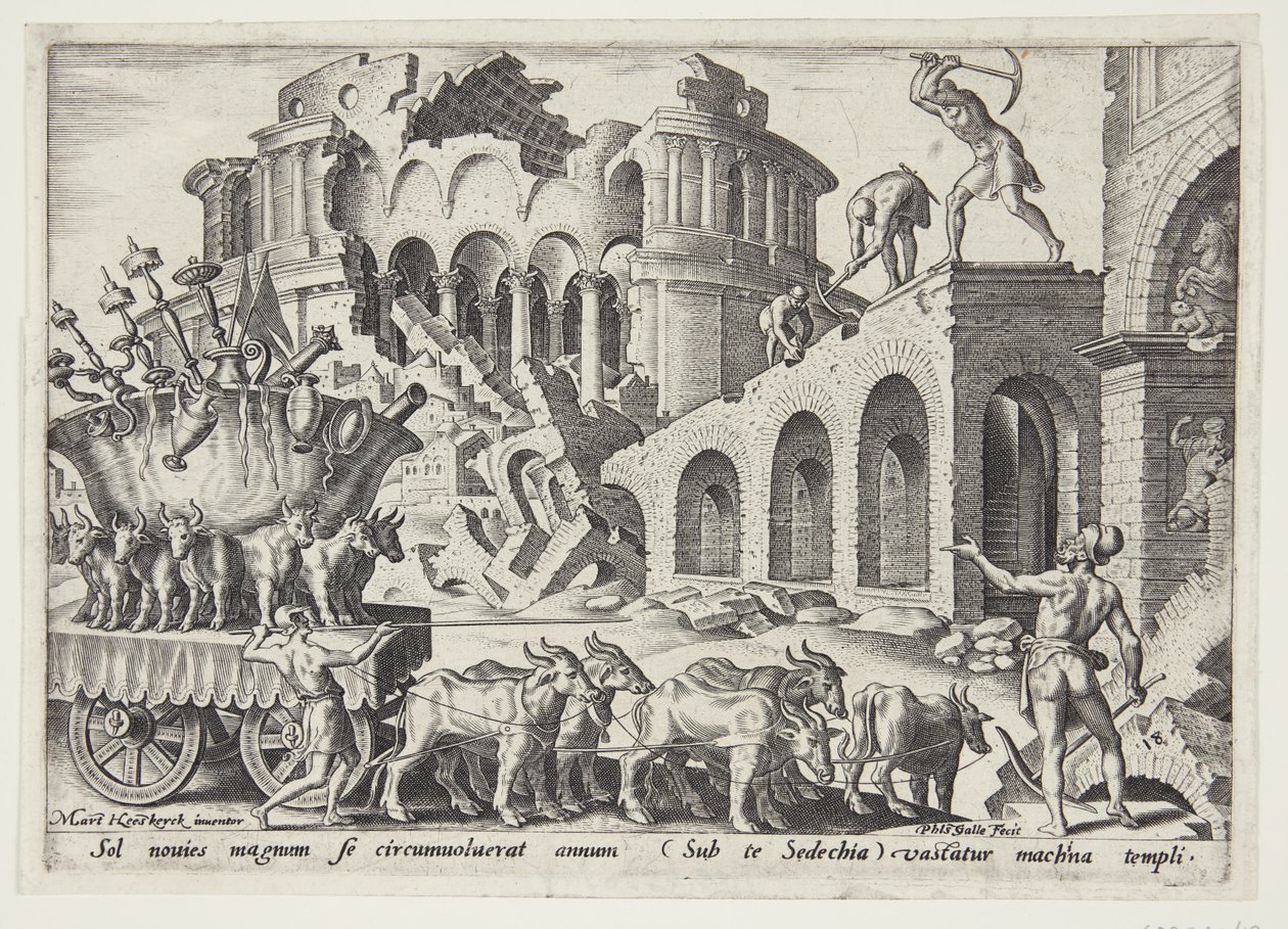 Die Chaldäer tragen die Tempelschätze fort(The Chaldeans carrying away the temple treasures)Philips Galle,Maarten van Heemskerck(after model by),Philips Galle(publisher) |