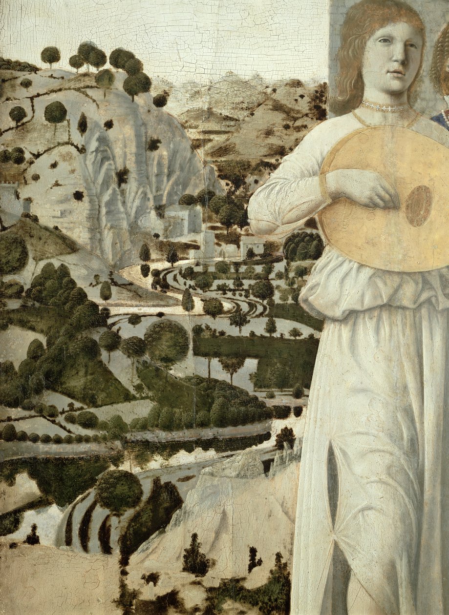 unvollendet · engel · laute · renaissance · italienische landschaft · gewundener fluss · hügel · musik spielen · National Gallery, London, UK / Bridgeman Images |