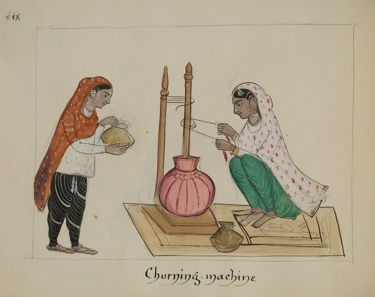 Zwei Frauen mit einer Buttermaschine(Two women with a churning machine)Punjabi School |