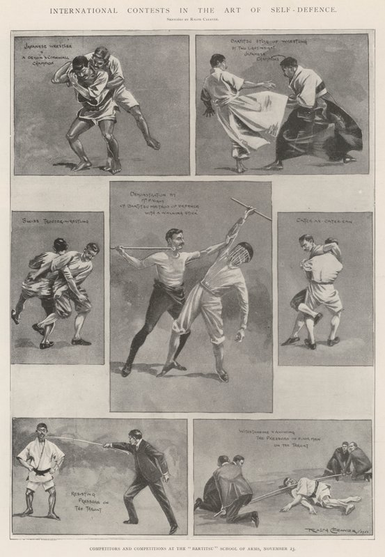 internationale wettbewerbe · kunst der selbstverteidigung · mitbewerber · wettbewerbe · bartitsu-waffenschule · 23. november · japanischer wrestler · devon · cornwall champion · bartitsu-stil des wrestlings · licht · gewicht · japanische meister · schweizer hosenringen · demonstration · herr p. vigny · bartitsu-methode der verteidigung · gehstock · widerstehen · druck · kehle · standhalten · vermeiden · selbstverteidigung · kampfkunst · Private Collection / Bridgeman Images · / Look and Learn |