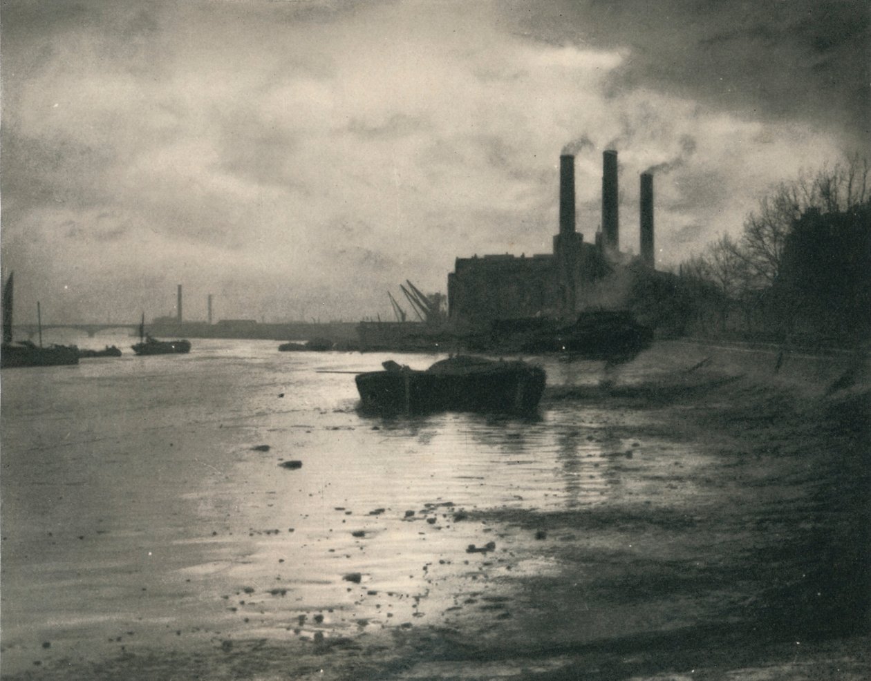 draußen · fluß · szenisch · gebäude · gebäude · london · england · fluß themse · themse · landschaft · verunreinigung · gezeiten · dämmerung · geographie · von hinten beleuchtet · dämmerung · industriell · kamin · jahrhundert · niedrige gezeiten · konzept · kraftwerk · riverbank · zwanziger jahre · natürliche phänomene · zeit · einfarbig · veraltet · publikation · schwarzes u. weiß · schwarzes und weiß · zwanziger jahre · 20. jahrhundert · chelsea · kensington und chelsea · photograph · landscape · landscape to studio · reginald belfield · belfield · reginald · methuen co ltd · methuen co · methuen co. · methuen co. ltd · chelsea power station · lots road power station · The Print Collector/Heritage Images |