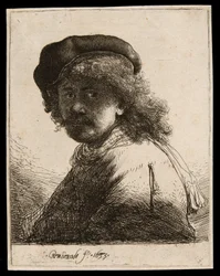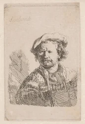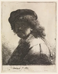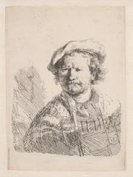 Rembrandt mit einer flachen Mütze und einem Schal um die Schultern(Rembrandt in a flat cap with a shawl about his shoulders)Rembrandt van Rijn |
