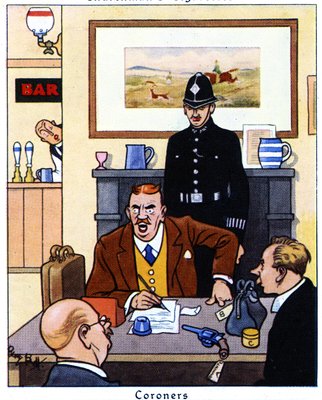 Gerichtsmediziner führt eine Untersuchung zu den Ursachen und Umständen eines Todes durch, 1936(Coroner conducting an inquest into the causes and circumstances of a death, 1936 )René Bull |