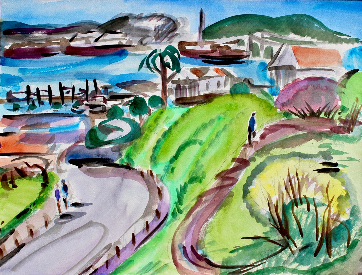 küste · küste · küste · küste · meer · aussicht · aussicht · bucht · küste · wasser · seelandschaft · landschaft · im freien · schiff · schiffe · feld · straße · pfad · person · personen · menschen · paar · aquarell · malerei · haus · häuser · flora · grün · orange · blau · braun · lila · farbe · bunt · figurativ · hügel · hügel · kalifornien · amerikanisch · land · landschaft · ländlich · ländlichen · Private Collection / Bridgeman Images |