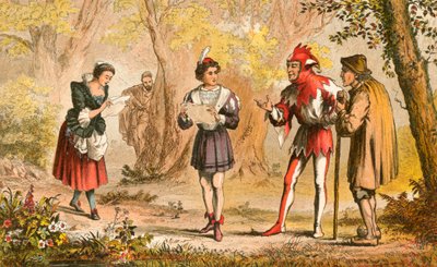 Rosalind spricht in Wie es euch gefällt, Akt III, Szene II, 'Ruhe! Hier kommt meine Schwester', aus 'The Illustrated Library Shakespeare', veröffentlicht London 1890(Rosalind speaks in As You Like It, Act III, Scene II, 'Peace! Here comes my sister', from 'The Illustrated Library Shakespeare', published London 1890 (colour litho))Robert Dudley |