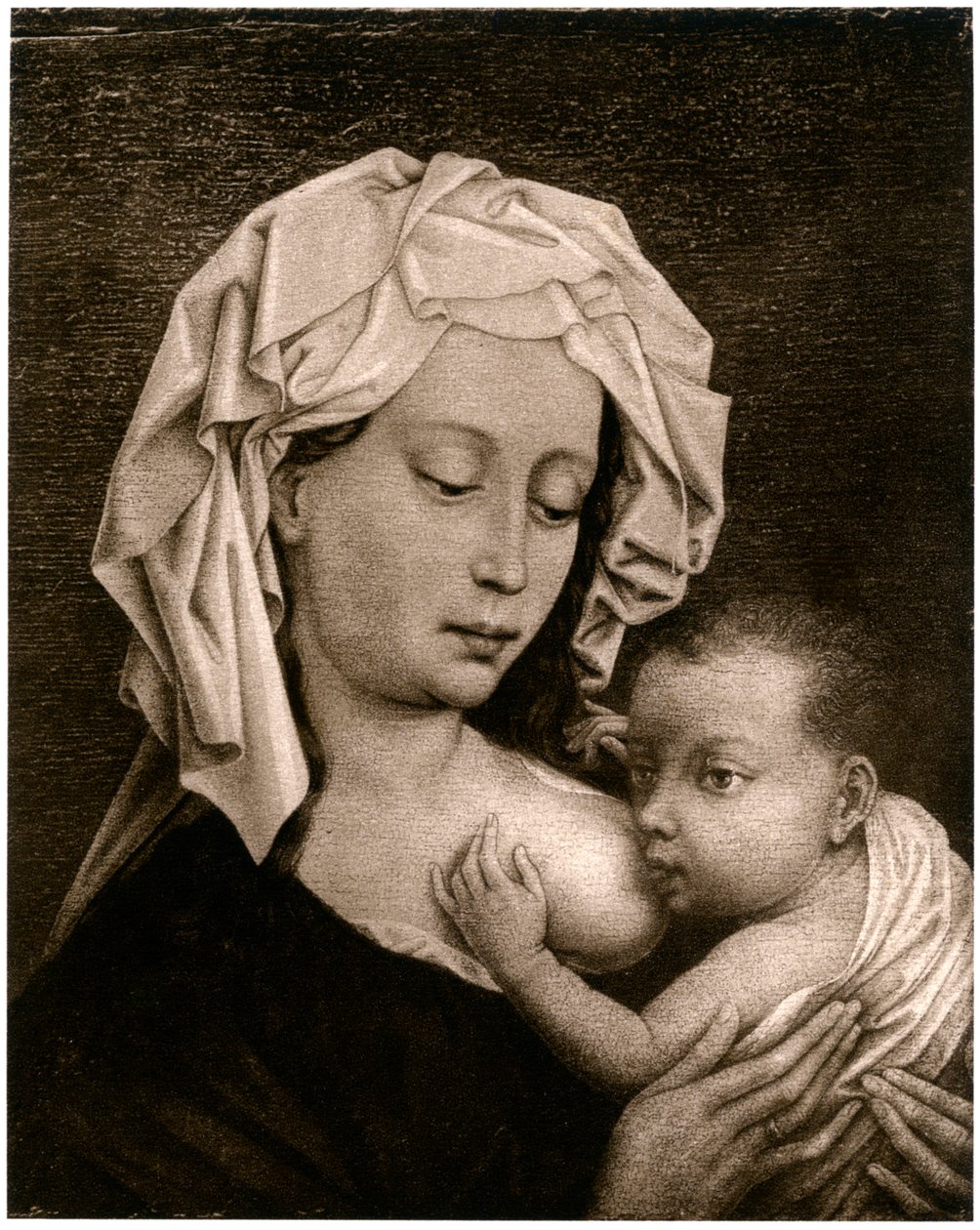 portrait · frau · kaukasisch · frauen · frau · leute · kind · kinder · zuhause · schauen · familie · baby · babys · flandern · headdress · mutter · mutterschaft · position · jahrhundert · nach innen · druck · säugling · dame · breastfeeding · zwanziger jahre · unten schauen · einfarbig · mama · familienleben · flämisch · schwarzes u. weiß · schwarzes und weiß · zwanziger jahre · 20. jahrhundert · virgin mary · mary · portrait · madonna · virgin · saint mary · virgin mother · mother of god · the virgin mary · stella maris · st mary · rogier van der weyden · weyden · rogier van der · The Print Collector/Heritage Images |