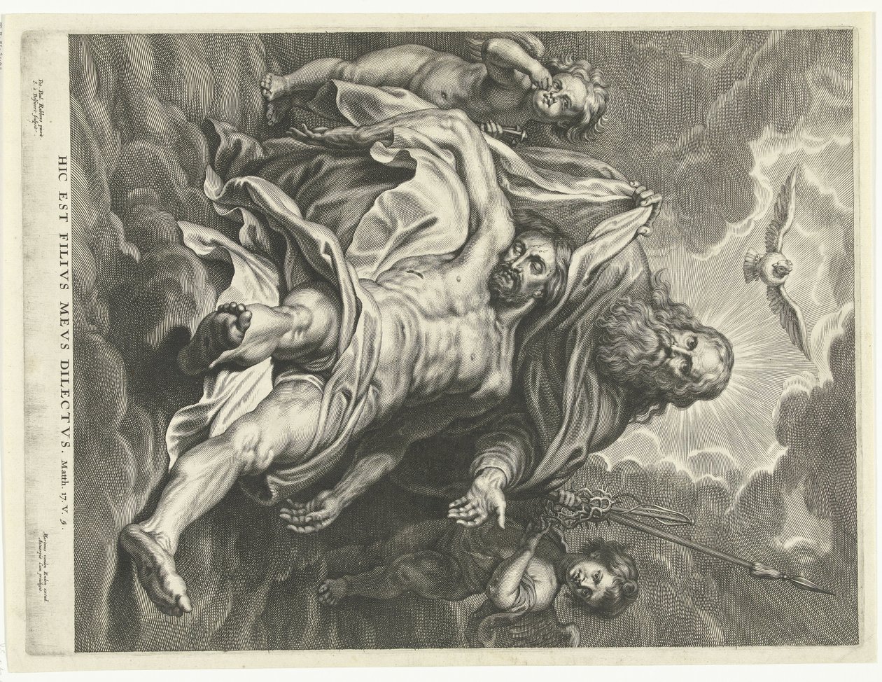 Heilige Dreifaltigkeit und Engel mit Leidenswerkzeugen(Heilige Drieëenheid en engelen met lijdenswerktuigen)Schelte Adamsz. Bolswert(print maker),Peter Paul Rubens(after painting by),Martinus van den Enden(publisher) |